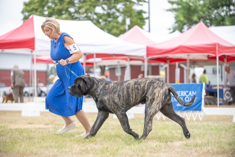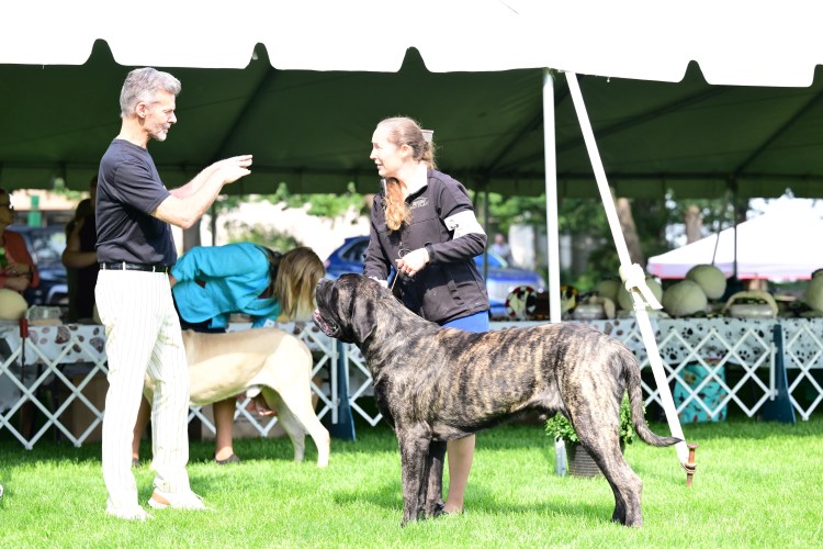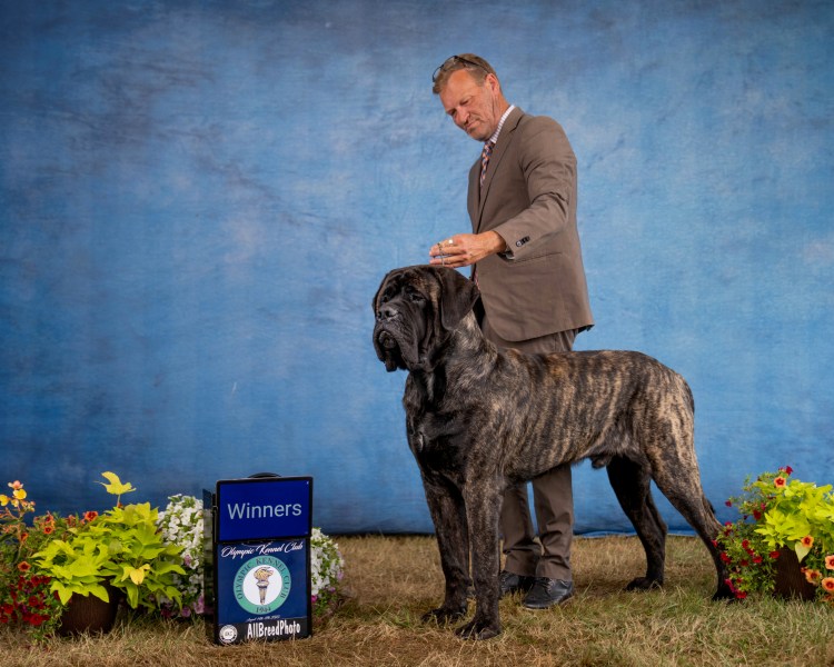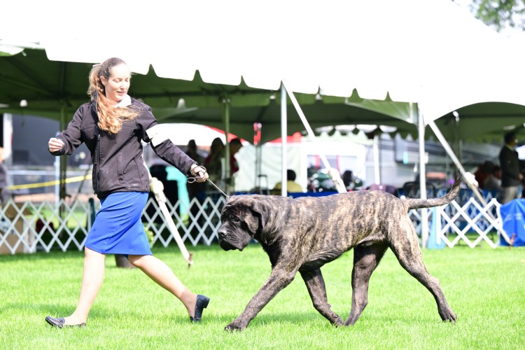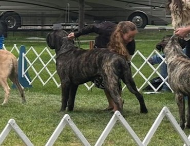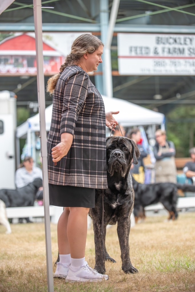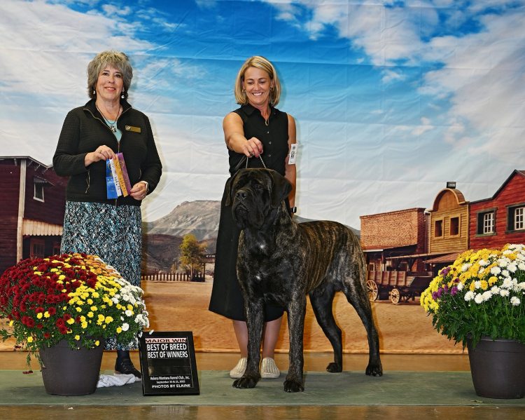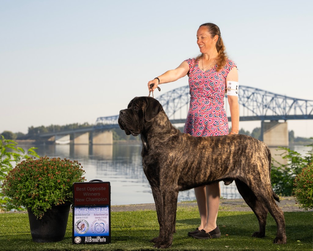 September 2025 Greeley CO for a Working Dog Specialty, Mastiff Specialty and an ALL Breed show, Yoshi won his class a few days, but did not earn any points. He skipped the following weekend, then went to Helena MT to the Round Up Cluster. It was a 4 day show. He sat out day 1, took a breed win day 2. Repeated days 3 and 4 by going Breed, Best of Winners for repeat 4 point MAJORS!! He chased this weekend with the 4 day Tri Cities Cluster by winning Best of Opposite/Winners Dog for a 3 point MAJOR day 2, and on day 4 he finished his CHAMPIONSHIP by going Winners Dog and Best of Opposite again for another 3 point MAJOR!!